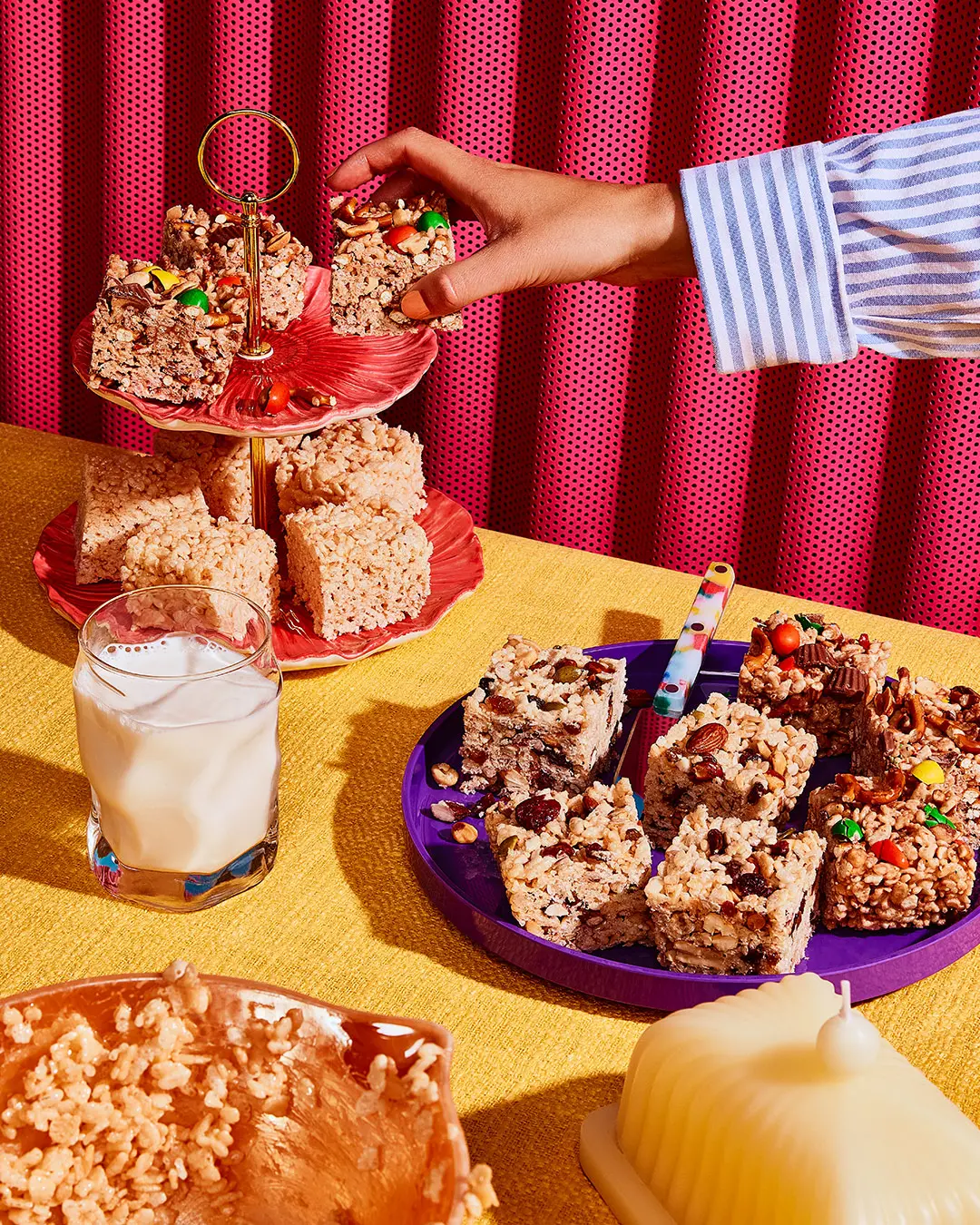 Ces carrés aux céréales de riz croustillant se déclinent en trois versions à partir d’une même base de beurre, guimauves et céréales. La version classique reste fidèle à la recette originale, tandis que les deux autres ajoutent noix, fruits séchés, bretzels ou bonbons au chocolat pour varier les textures.
