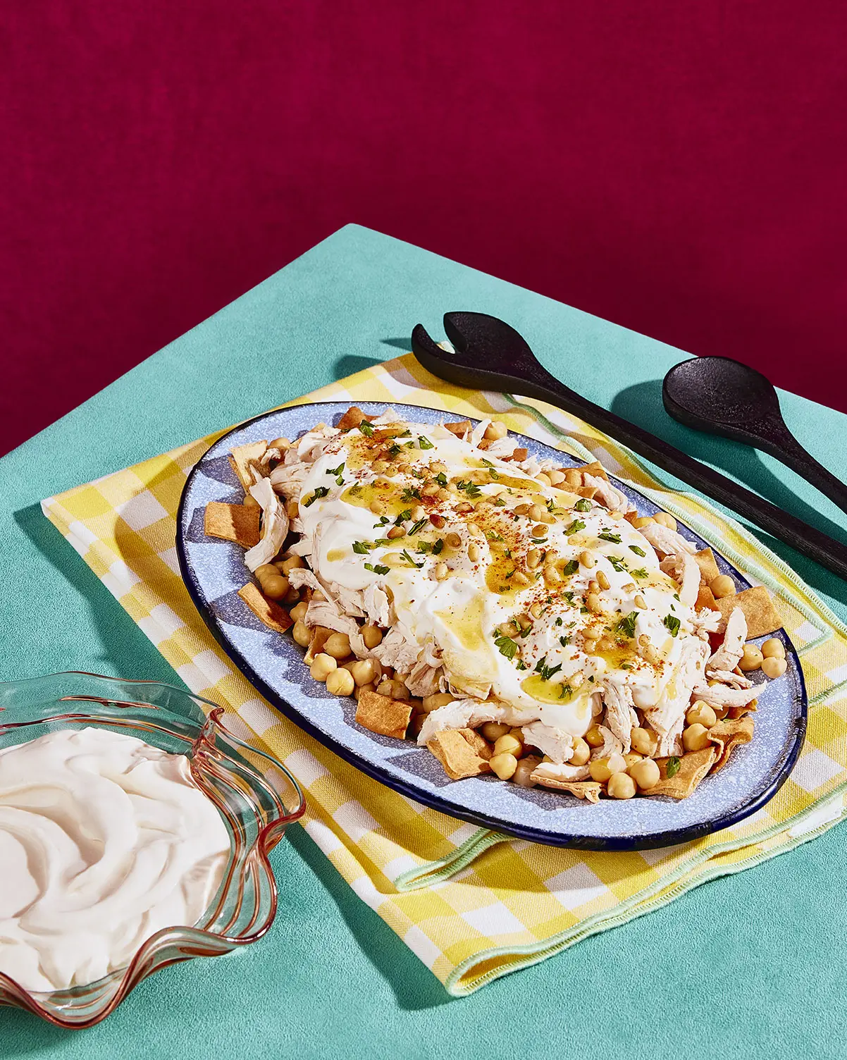 Le fattet djaj est un plat syrien composé de couches superposées : pain pita grillé, pois chiches chauds, poulet effiloché et sauce au yogourt au tahini. L’ensemble est nappé de beurre fondu aux noix de pin et relevé de piment d’Alep.