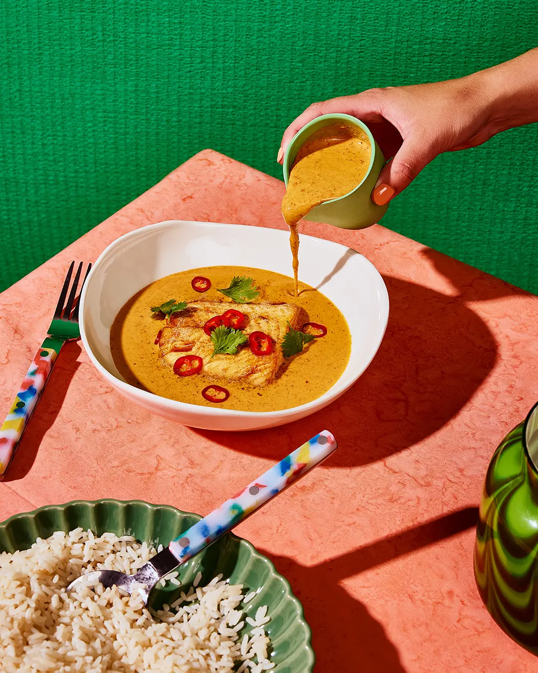 Côté légumes, privilégiez des bok choy sautés, des haricots verts vapeur ou des épinards tombés à l’ail. Un filet de jus de lime au moment du service apporte de la fraîcheur et équilibre la richesse de la coco.