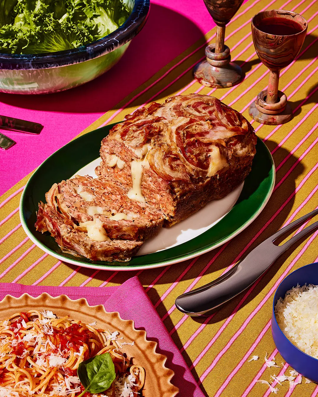 Le polpettone est la version italienne du pain de viande : un mélange de porc et de veau hachés, parfumé au parmesan, au fenouil et à l’origan, avec un cœur de mozzarella fondante et une couverture de pancetta dorée au four.