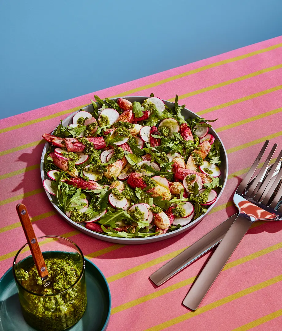 Nous assemblons la salade juste avant de servir. Nous disposons la roquette dans un plat, ajoutons les radis rôtis et quelques radis crus en rondelles. Nous servons le pesto à part, chacun peut ainsi ajuster la quantité selon ses envies.