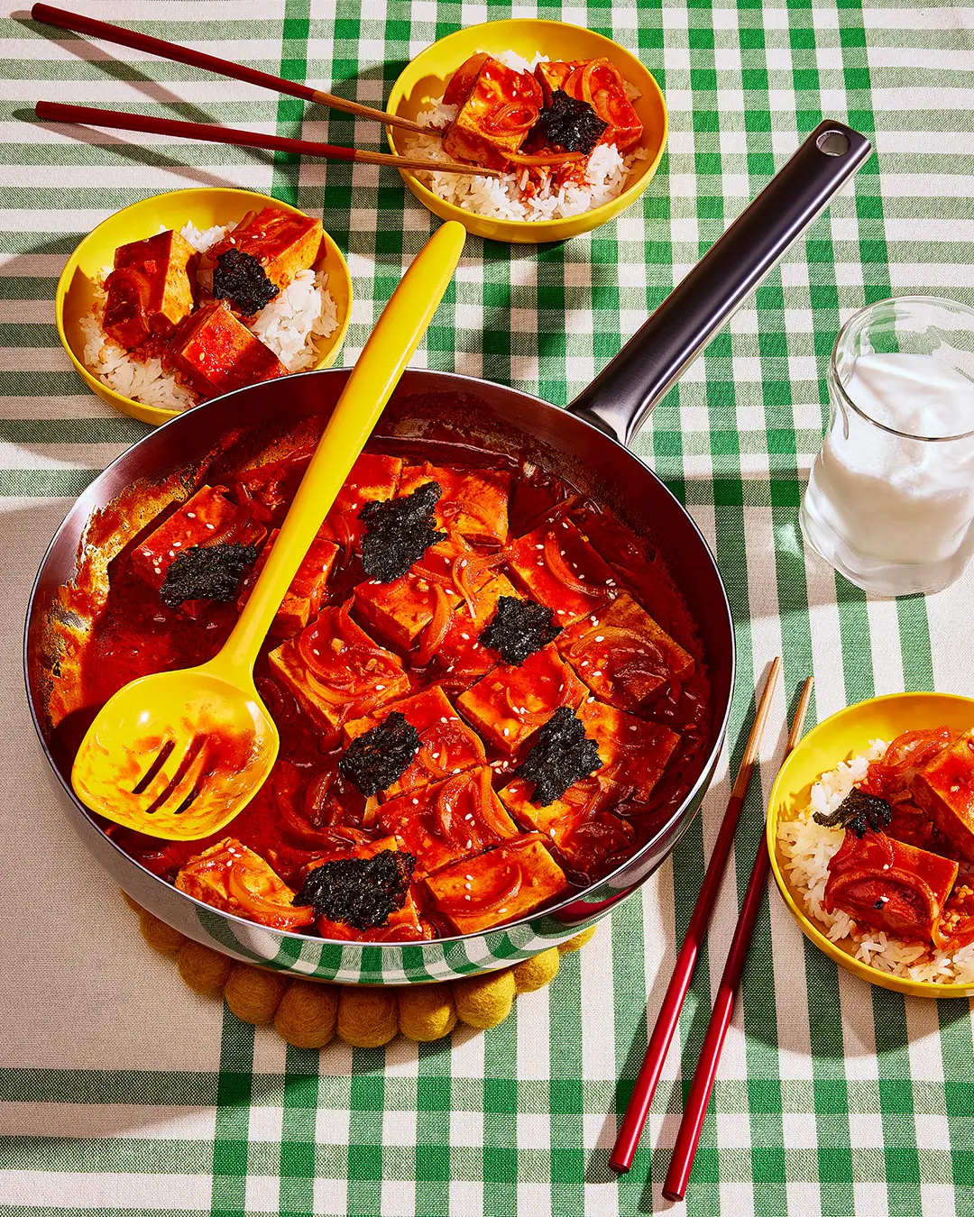 Le riz blanc vapeur reste le meilleur compagnon pour ce tofu. Préférez un riz rond japonais ou un riz à sushi. Servez-le dans des bols creux pour que la sauce enrobe chaque grain.